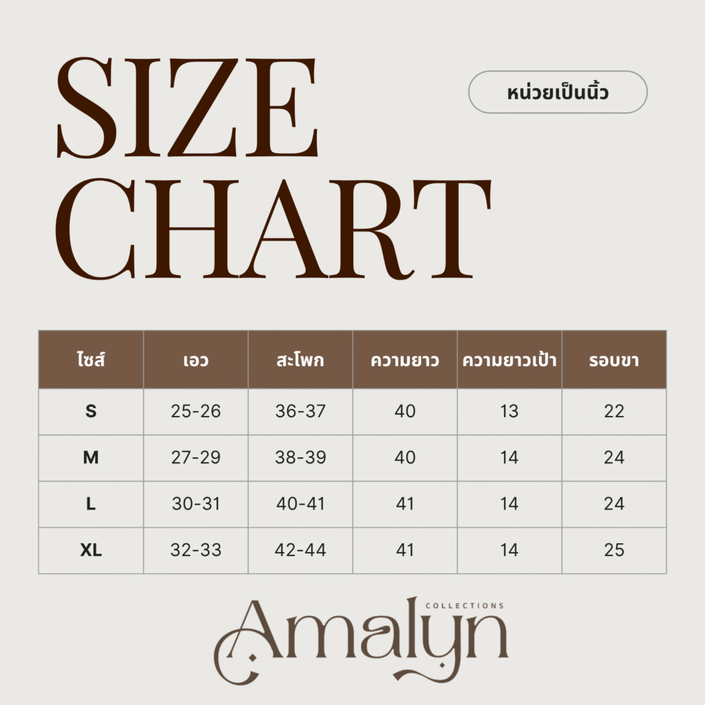 ผลิตภัณฑ์ ผลิตโดย Amalyn Collections แบรนด์ไทย ออกแบบและผลิตในไทย โดยช่างคนไทย ความพิเศษ กางเกงขายาว ขากระบอกยาว ให้ความรู้สึกสบายในการสวมใส่ สามารถใส่ไปทำงานได้ทุกวัน